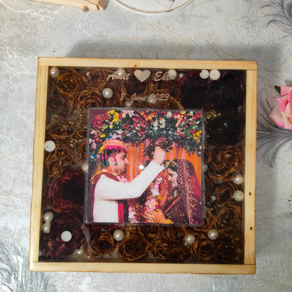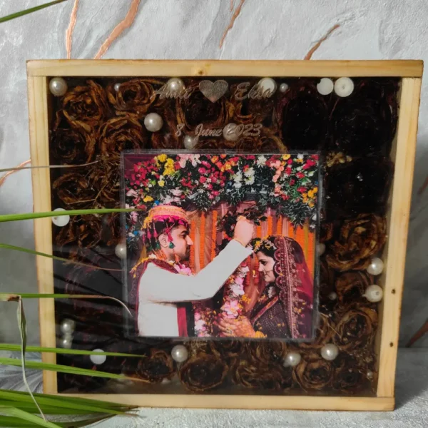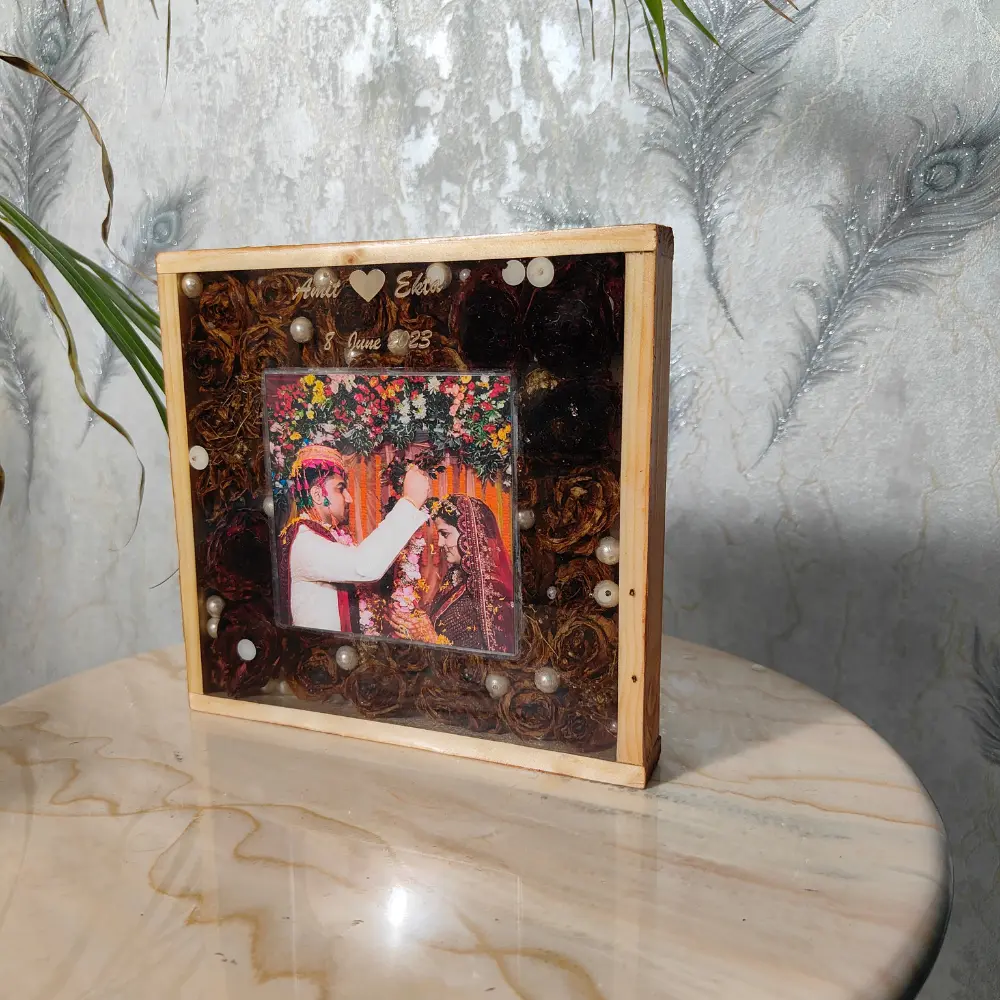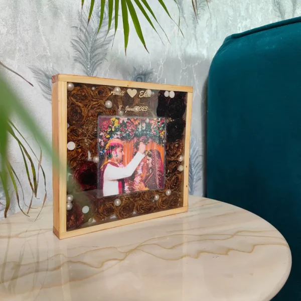 Turn your wedding memories into something you can display and admire every day with our Square Resin Photo Frame. Carefully preserved varmala flowers are set in shining epoxy resin, creating a timeless piece that reflects your special day. The frame’s clean square design and soft gloss finish make it perfect for adding charm to any corner.