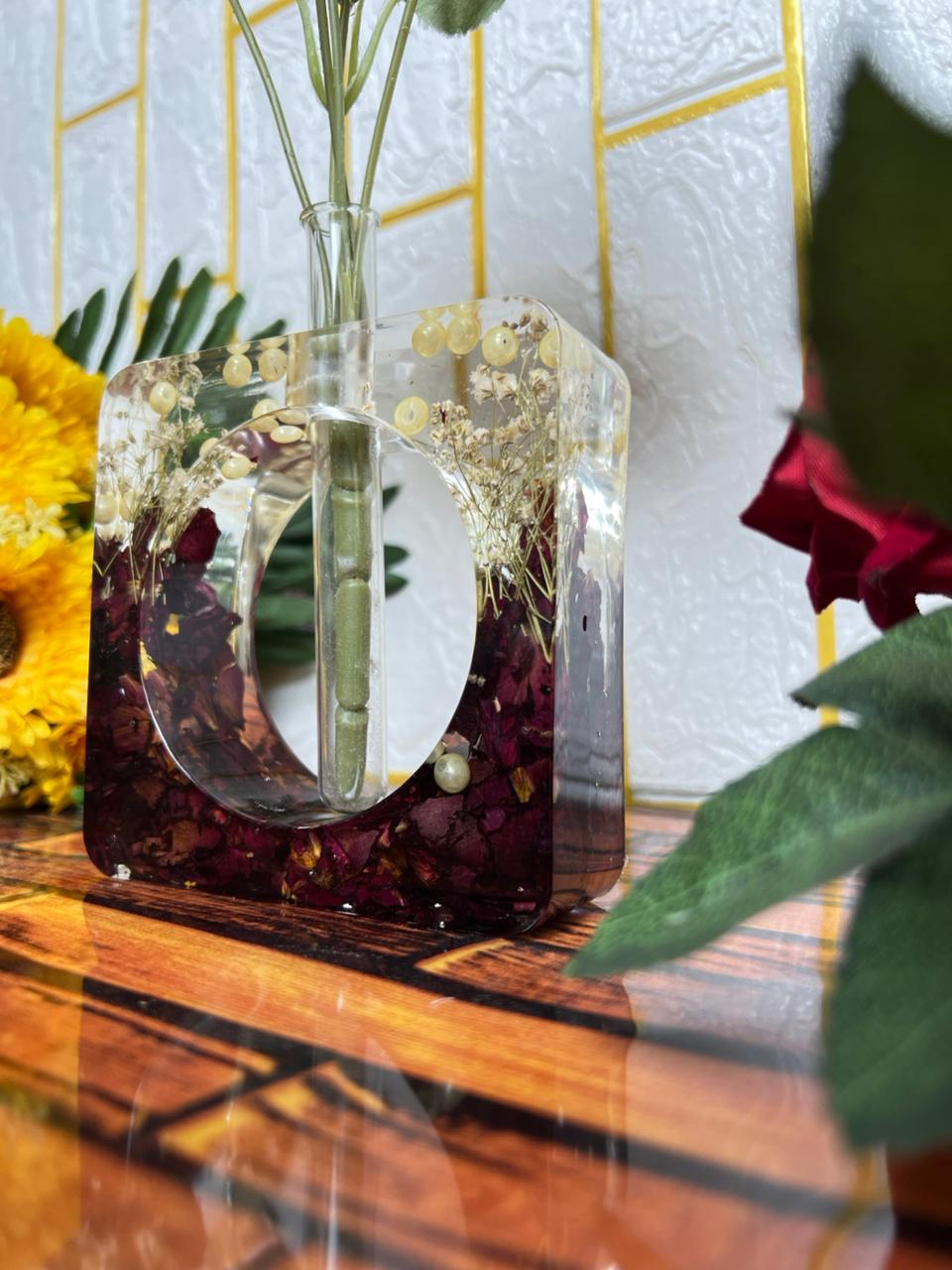 Bring the beauty of nature into your home with this Square-Shaped Flower Preserved Planter. This vase is handcrafted using real dried petals, pearl beads, and delicate fillers, carefully sealed in high-quality resin to keep their charm forever. The high-quality resin body allows the preserved flowers inside to shine beautifully, creating a perfect balance of art and elegance.